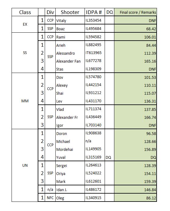 דף תוצאות PDF הכולל גם תוצאות היורים באקדחים שאינם מתאימים לחטיבות IDPA.