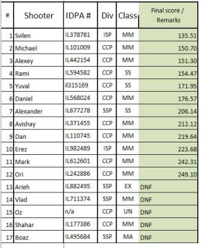 דף תוצאות PDF הכולל גם תוצאות היורים באקדחים שאינם מתאימים לחטיבות IDPA.